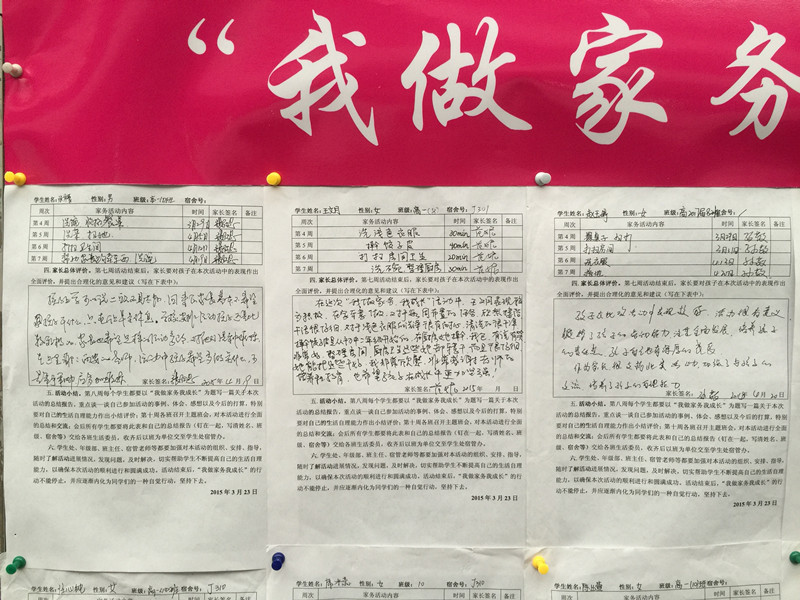 为了使此项活动能达到预期的成效,高一年级部做了总动员,各班也做了积极的扎实的工作,班主任不仅动员学生积极参与这项活动,同时召开主题班会对这项活动进行总结,并及时把活动的相关材料收集交送到学生处宿管办。从回收的材料看,高一全体学生对此项活动投入了很高的热情,不仅积极做好家务劳动,而且对此项活动做了认真、积极、富有深刻意义的总结;很多家长在积极支持和配合学校这项活动的同时,在百忙之中还对学生在活动中的表现做了认真全面客观的评价,有不少的家长在积极肯定学校此项活动的同时,还提出了不少合理化的意见和建议,令我们非常感动。