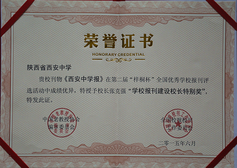 6月30日,在山东曲阜举办的第二届“梓桐杯”全国优秀学校报刊评选表彰大会暨校园文化建设创新论坛与校园编辑培训圆满结束。我校校报《西安中学报》在此次评选活动中,以98高分获得校报综合金奖,95分获策划金奖,98分获编辑金奖。鉴于我校校报的综合质量及对此项工作的重视程度,通过专家评委组综合评定,授予我校报刊建设特别奖,张克强校长获学校报刊建设校长特别奖,薛锋副校长获学校报刊建设主编特别奖,魏省瑜主任获策划金奖。我校校报主编张莉老师参加了大会并在大会上就《校报如何面对新媒体时代的挑战》发言,全面展示了我校校报的办报思路和内容特色,展示了我校校报开通数字报、微博、微信,形成立体化建构的模式以及对于校报建设的一些思考。