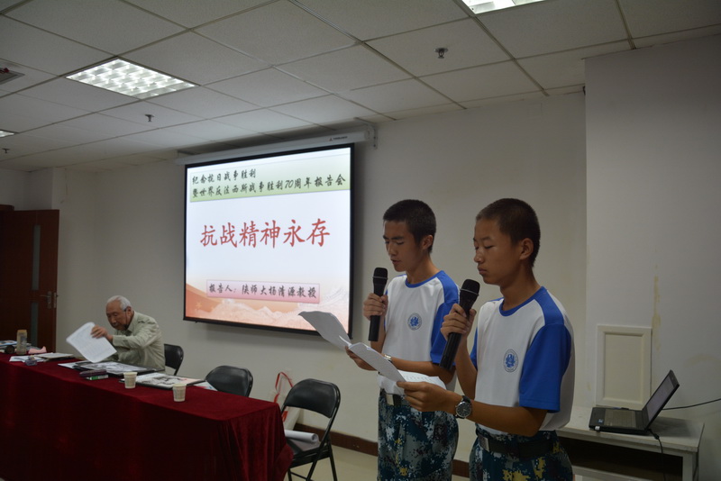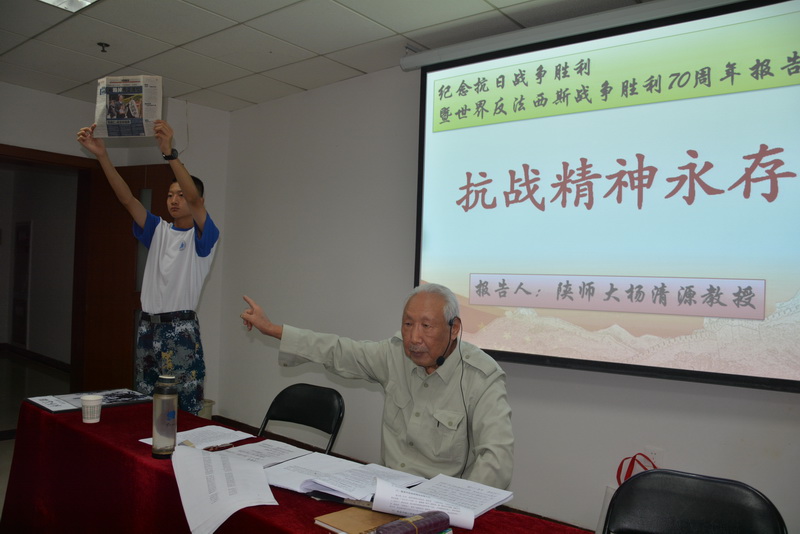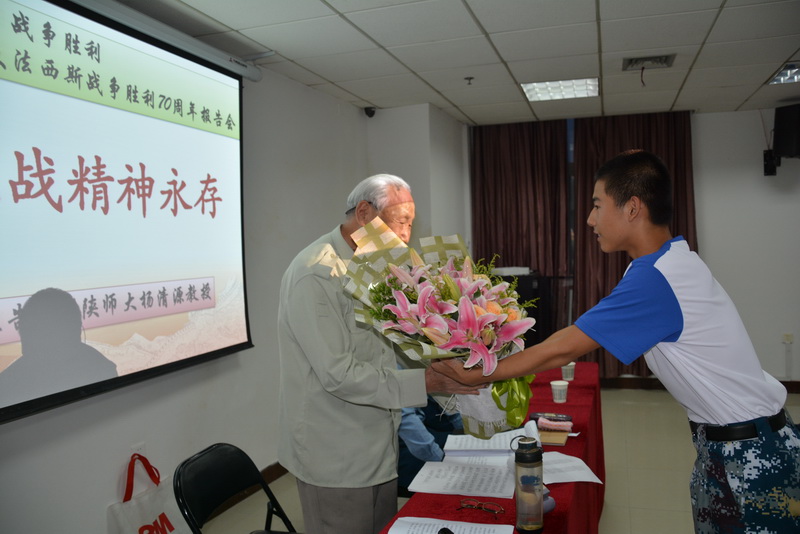 杨教授思维缜密、逻辑清楚、表述准确、语言生动、声情并茂,那种爱党爱国的忠诚品质,那种筑我长城扬我军威的雄心壮志,那种爱校爱生关怀后辈的殷切希望感染了在场的每一个人。讲至激动处,老人拍案而起,站着讲。学员们屏气凝神、专心致志、用心聆听、认真做笔记,他们完全被老人精彩的讲述所吸引,被伟大的抗战精神所感染。听完报告后,航空一班的何易洋同学说:“听了这节课,使我对抗战有了更深刻的了解,对祖国的命运更加关切,对当时受难的同胞们更加同情,对日本帝国主义的暴行更加痛恨。希望我的祖国可以愈加强盛。”航空二班的李煜同学表示:“我一定要努力学习,刻苦奋斗,带着老一辈嘱托,弘扬抗战精神,努力使自己成为一名合格的中国人和空军后备人才。”