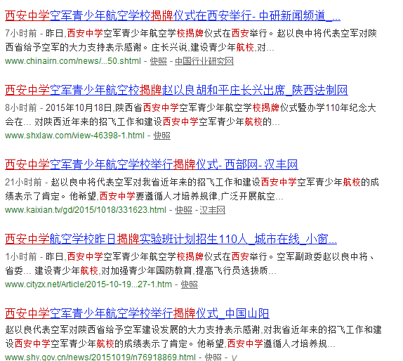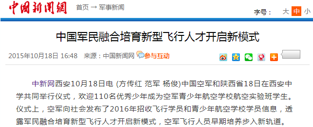 10月18日我校空军青少年航空学校揭牌一事,受到全国省市各媒体的热烈关注和深度报道,电视媒体央视新闻、陕西新闻、都市快报等进行了专题报道;平面媒体《陕西日报》和《三秦都市报》均在头版位置给予报道,华商报在要闻版进行了专题报道;网络媒体更是纷纷转载,陕西传媒网、华商网以及中国新闻网、新华网、网易、搜狐等各地网络媒体都有转载报道。