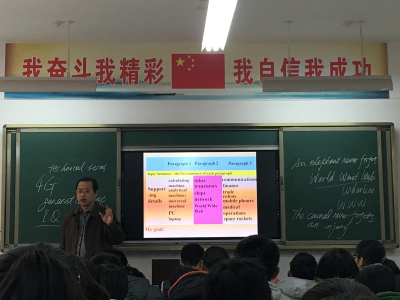 我校周老师对于这样一篇术语繁多、学生理解较为困难的文章进行了“简单化”的处理。从课本教材课后的两道练习题入手,让学生通过朗读和听力的方式找出文章每段的主题句。在让同学站起来朗读课文以及找主题句的过程中,面对学生所出现的问题,周老师循循善诱,悉心引导学生,授之以渔,在阅读技巧教授的同时对于学生课外知识进行了扩充。在完成主旨大意的练习后,周老师又对于时间历史发展为主题的说明文的写作进行了方法指导。