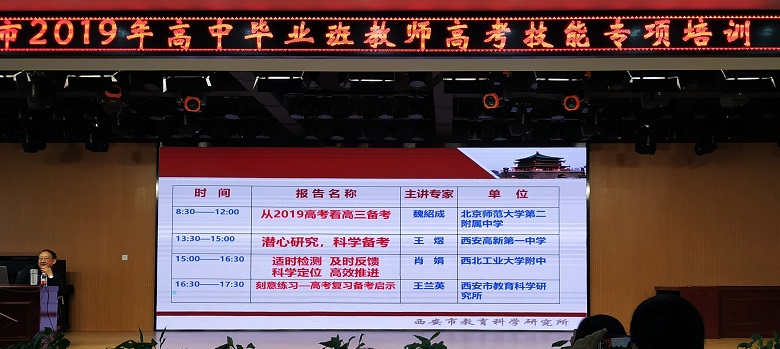 培训会由西安市教科所王兰英老师主持。培训会邀请了北京师范大学第二附属中学的魏绍成老师深入细致的分析了2020年高考备考方向;西安高新一中的王煜老师从实操层面为大家分享了高考备考的经验和做法;西北工业大学附中的肖娟老师分享了AI在考试方面是如何帮老师们减负、增效的;最后西安市教科所的王老师强调了刻意练习的重要性。