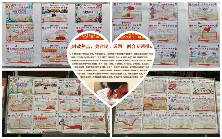 小小的一张手抄报,蕴含着无穷的正能量。3月5日全国政协十三届四次会议开幕当天,学科组便立即行动,向各班逐一宣传落实活动方案。随后,同学们纷纷积极回应,通过多种途径认真收看“两会”盛况,关注“两会”动态,热议“两会”话题,学习“两会”精神。大家大展身手,在参与的过程中进一步认识国情、了解社会,受教育、长才干。在对信息进行提取、编排、加工之后,他们通过图文并茂的形式,或是聚焦热点话题,传播两会“好声音”;或是回归教材追根溯源,强化知识迁移能力;或是面向未来建言献策,展现出“后浪”们的思辨能力。学科组对所有学生的手抄报进行了集中汇总,从中精心遴选了四十余份进行了展示,并对优秀作品予以表彰奖励。