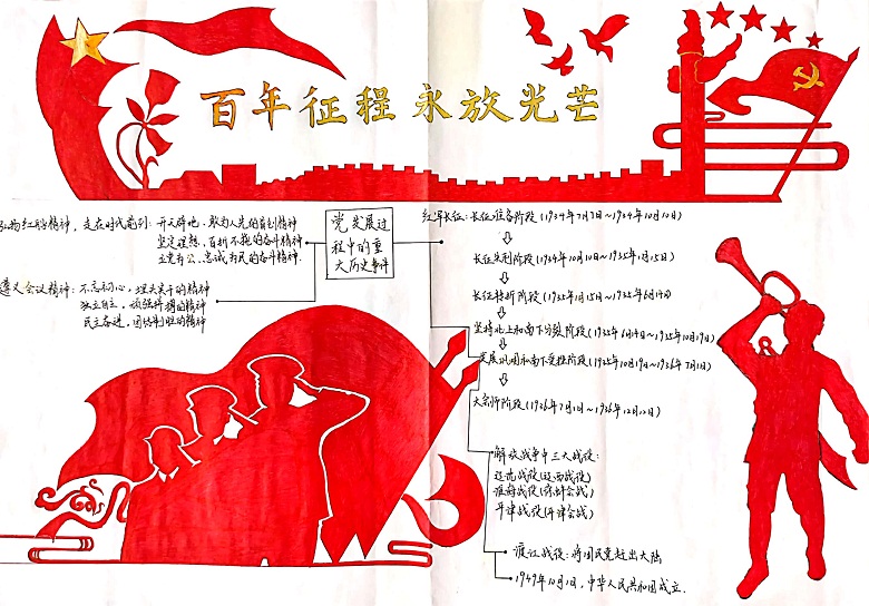 理科四班的王钰涵:似乎是转眼之间,共产党已走过了峥嵘百年岁月,回首这不易百年,为牢记历史,我怀着无比崇敬的心情绘下着份思维导图,一笔一画,我似乎又见证了共产党人从一只摇摇晃晃的小船成长为一艘航母的艰难岁月,这段路鼓舞着每一位中华儿女,对于这份作品,也许结果不重要,重要的是,蕴含在过程中的那份意义,那份使命与传承。