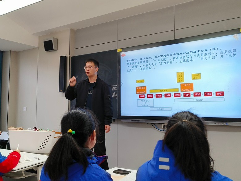 接着,刘老师利用时间轴的形式,由学生自主梳理本课基础知识,教师引导总结。在第一部分“(我们)站立起来了”,学生扮演地主、民族资本家、蒋介石、美国、苏联等不同角色,思考会对刚诞生的新中国有怎样的反应或期待?教师总结道新中国从国体、道路到格局都站起来了,中国历史进入新纪元。在第二部分(他们说我们)“这也不行,那也不行”?学生阅读教材第二子目,整理新中国初期的土改运动产生了哪些积极影响?教师提示新中国成立初期以土地改革来破局,在经济、政治、社会等多方面达到了积极影响。在第三部分“达到(我们)自己的目的”学生扮演国家、个体小农、资本家说出自己的诉求,并思考“他们”会怎样满足自身的诉求?教师结合毛泽东的报告分析国家迫切需要建成工业化的要求、方案与政策。最后,刘老师以毛泽东的《矛盾论》升华本课主旨:矛盾存在于一切事物的发展过程中,每一事物的发展过程中存在著自始至终的矛盾运动,所以要用不同的方法去解决不同的矛盾。本堂课学生思维活跃,沉浸投入历史角色,紧跟教师节奏,深度达成学习目标。