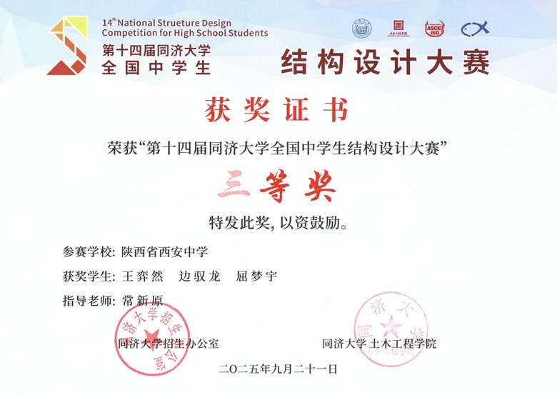 我校参赛队获得同济大学全国中学生结构设计大赛三等奖