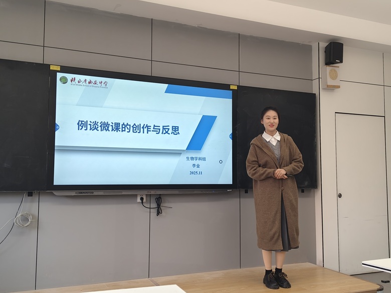 首先,李金老师结合其荣获陕西省微课大赛一等奖的系列微课创作经验,进行了以“例谈微课的创作与反思”为主题的分享。她首先回顾了自己的探索历程,强调优质微课源于系统性的构思与不断的自我反思。微课的制作始于精准的选题,要聚焦于教学中的重难点,或是传统课堂上难以直观呈现的过程。李金老师详细阐述了从“选题精炼”到“脚本打磨”的关键步骤,认为脚本不仅是旁白文字,更是教学逻辑、视觉呈现和节奏控制的蓝图。最后,她还分享了从零开始学习剪辑软件的心得,鼓励老师们不畏技术门槛,通过实践将创意转化为现实,并在此过程中持续反思、优化迭代。承接李金老师对宏观规划的阐述,冯芬老师的分享则聚焦于系列微课的实践落地之道。她以实战视角,将系列微课开发细分为准备、设计、制作、完善四个阶段,为化学组老师提供了极具操作性的参考范本。随后,姜雯老师带来了单节微课的精细化设计智慧,通过生动的对比案例,示了如何基于学情分析确定教学焦点,并现场讲解了多种将抽象概念转化为直观形象的动画技巧与视听呈现方法,体现了“微课之‘微’,在于教学焦点精准”的设计精髓。