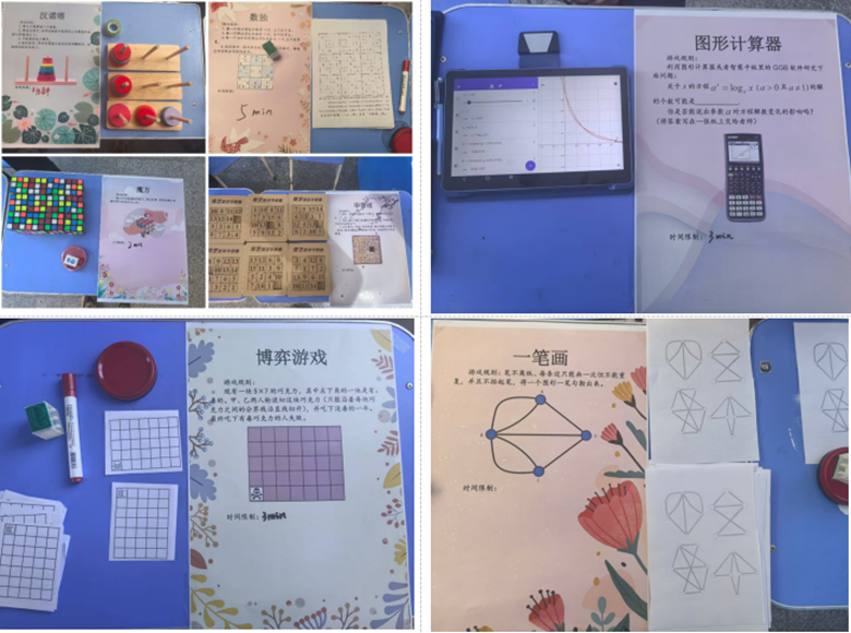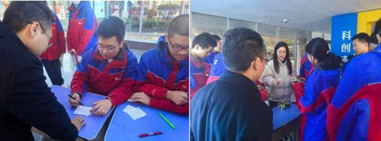 活动现场氛围热烈有序,各团队分工协作、默契配合,充分展现良好学科素养与团队精神。华容道、汉诺塔关卡前,学生们推演思路、调整策略,高效完成布局还原,凸显逻辑推理能力;三阶魔方挑战中,参与者指尖灵活运转,快速实现色块归位,尽显技能积累;数独、博弈游戏区域,学生们结合数学知识分析规律、审慎决策,在思维碰撞中突破解题难点;图形计算器关卡则引导学生借助工具完成函数建模与数据运算,强化数学工具实践应用意识。教师志愿者全程坚守岗位,精准解读规则、适度启发思路、细致记录进度,既保障活动公平公正,也为学生闯关提供有效支撑,现场师生互动频繁、氛围融洽。
