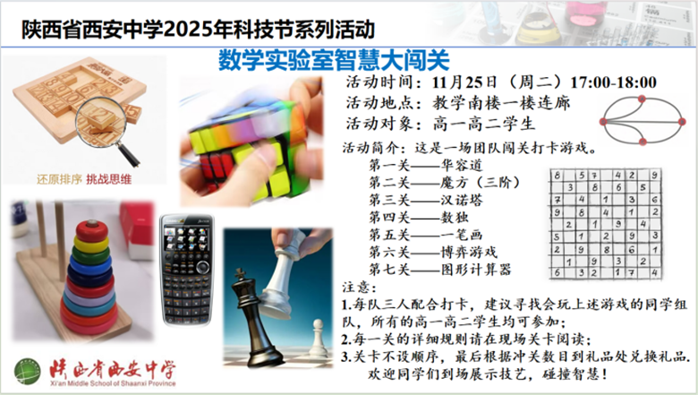 为落实学科核心素养培养要求,丰富校园科技文化生活,11月25日17:00至18:00,陕西省西安中学2025年科技节系列活动之“数学实验室——智慧大闯关”活动在教学南楼一楼连廊顺利开展,高一、高二年级学生以三人团队为单位踊跃参与。