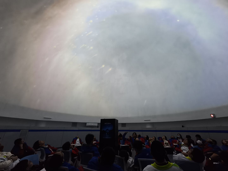 11月25日,活动首日在天象馆内拉开帷幕。当巨大的球形穹幕点亮,浩瀚星空瞬间笼罩全场,同学们仿佛被带入无垠宇宙之中。从太阳系的秩序井然,到银河系的壮丽旋臂,从恒星的诞生与湮灭,到黑洞的深邃神秘,一幕幕宇宙奇景在头顶全景展开,配合环绕音效与专业讲解,带来极具冲击力的沉浸式体验。这场球幕观影不仅生动还原了星空图谱,更让课本中的天文知识“活”了起来,深深触动了在场的每一位同学。