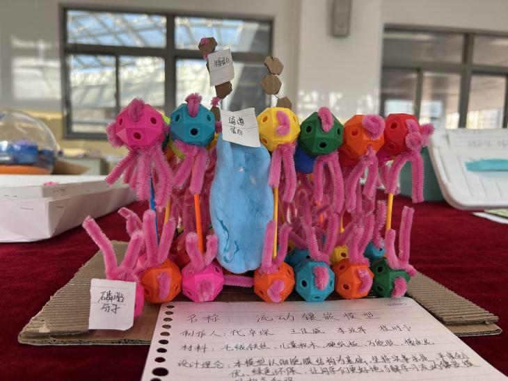 展出期间,模型前常常围满好奇的目光。有的作品以细腻的手工还原了线粒体的内膜结构,有的用废弃塑料与纸板构建出磷脂双分子层,更有同学运用光固化3D打印技术,精准呈现了细胞的亚显微结构。每一件作品背后,不仅是知识的凝练,更是智慧与情感的融合。不少同学在作品旁附上设计说明、创作心得甚至原创小诗,让模型也拥有了温度与故事。
