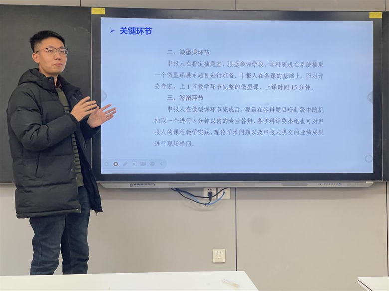 会议第二项由闫春更老师结合自身参与职称评定的实际经历,展开介绍了当前职称评定中教育教学能力测试的基本情况。他主要从考评的具体要求、完整的考评流程、需要重点关注的关键环节以及实际操作中的注意事项这四个方面,逐一进行了细致的说明。具体而言,他分别针对测评应试的时间分配与规划策略、对课本内容及个人申报材料的熟悉程度、教学展示内容的熟练性与创新性、教案书写的规范性与完整性、教学语言表达的准确性与感染力、答辩环节的准备方法与应答的逻辑条理性等重要方面,给出了详细而中肯的建议,这些经验分享务实而具有针对性,对准备参与职称评定的教师具有较高的参考价值。