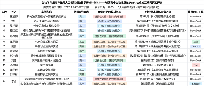 本次研修活动紧扣《教育部办公厅关于组织实施数字化赋能教师发展行动的通知》等文件要求,以“助力学习变革、教学提质、评价增效、研究创新”为核心目标,前期组织教师围绕高中生物核心知识点与实验教学难点,开展AI互动网页工具开发。参与教师每人聚焦一个教学主题,涵盖种群密度调查、光合作用、遗传规律、基因工程等必修与选择性必修模块关键章节,运用DeepSeek、Gemini、飞象老师等多元AI工具,完成了网页制作、使用说明撰写及核心指令记录等系列工作。