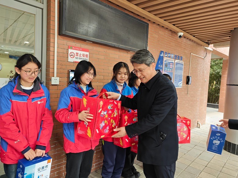 慰问过程中,校领导们详细询问了同学们假期的学习安排和生活情况,叮嘱大家要合理安排作息,注意防寒保暖和假期安全,勉励同学们要珍惜时光,努力学习。随后,领导们亲手为每一位西藏学生送上了精心准备的“压岁礼”,一份份饱含着美好寓意与关爱的礼物,让同学们深切感受到学校大家庭的温暖。
