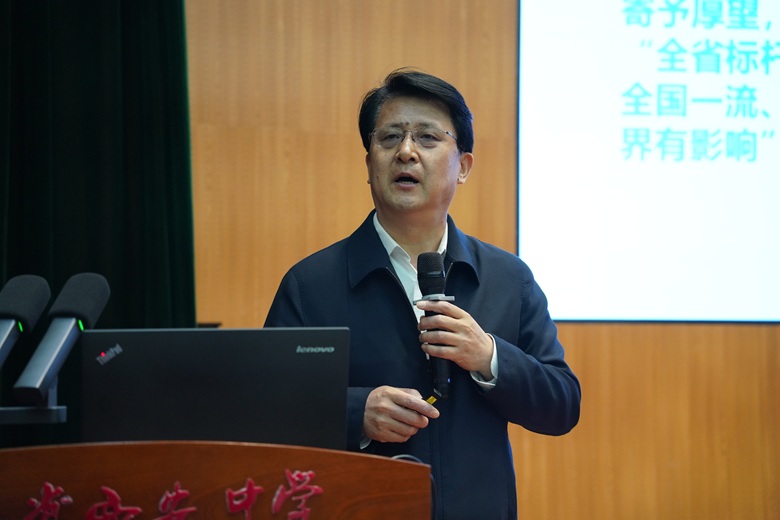 党委书记石峰虎以全新视野、全新理念、全新范式为全校教职工和全体党员做学校改革发展的主题报告,他重申了在行政扩大会上强调的本学期关于系统性变革的“八项行动”,要求全体教职工在工作中要严格做到融合定方向、人本铸文化、分层强教研、督导提质量、自主育新人、服务保运行、落实见成效、力行正作风。他在深入分析当前教育及我校面临重大发展机遇的前提下,全面系统精准地提出了学校改革创新发展的方略、目标、路径及主要任务,为学校高质量创新发展规划了愿景、擘画了蓝图、谋定了新篇。