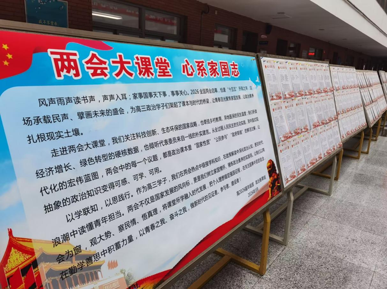 春潮涌动启新程,凝心聚力向未来。2026年全国两会在“十四五”圆满收官、“十五五”开局起步的关键节点顺利启幕,既为国家发展擘画宏伟蓝图,也为教育事业高质量发展指明前行方向。为深入落实立德树人根本任务,把两会精神全面融入校园育人全过程,帮助同学们全面学习两会知识、深刻领会两会精神内涵,引导学生坚定正确政治方向、提升思想政治学科核心素养,增强社会理解与公共参与能力,厚植关注时事、胸怀家国的公民情怀,近日,我校政治学科组教师精心策划、有序开展“青春履职 笃行担当”两会提案撰写活动与“两会大课堂”知识链接小报展览活动,以丰富多元的形式搭建起学生展现学科素养、践行青春担当的广阔平台,在校园内掀起学两会、议两会、践精神的浓厚热潮。