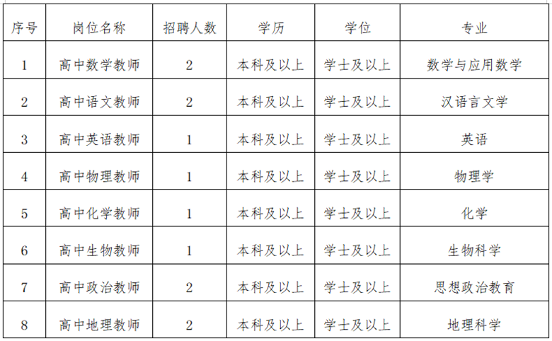 2.招聘岗位及人数:高中数学教师2名,高中语文教师2名,高中英语教师1名,高中物理教师1名,高中化学教师1名,高中生物教师1名,高中政治教师2名,高中地理教师2名。