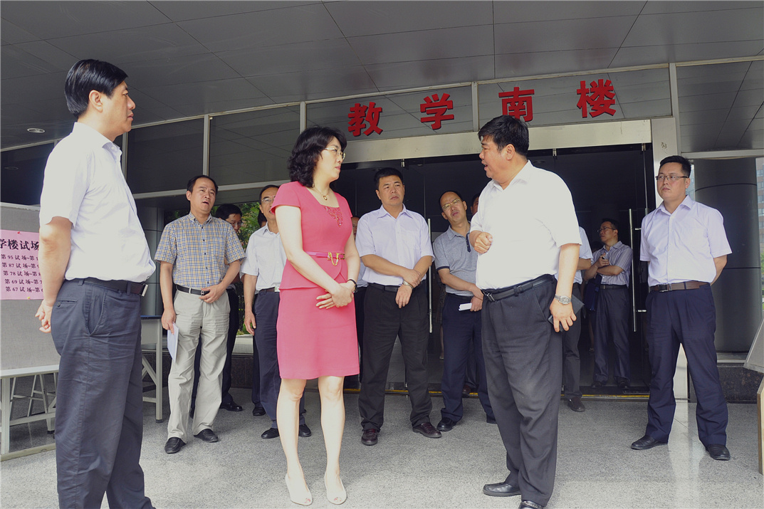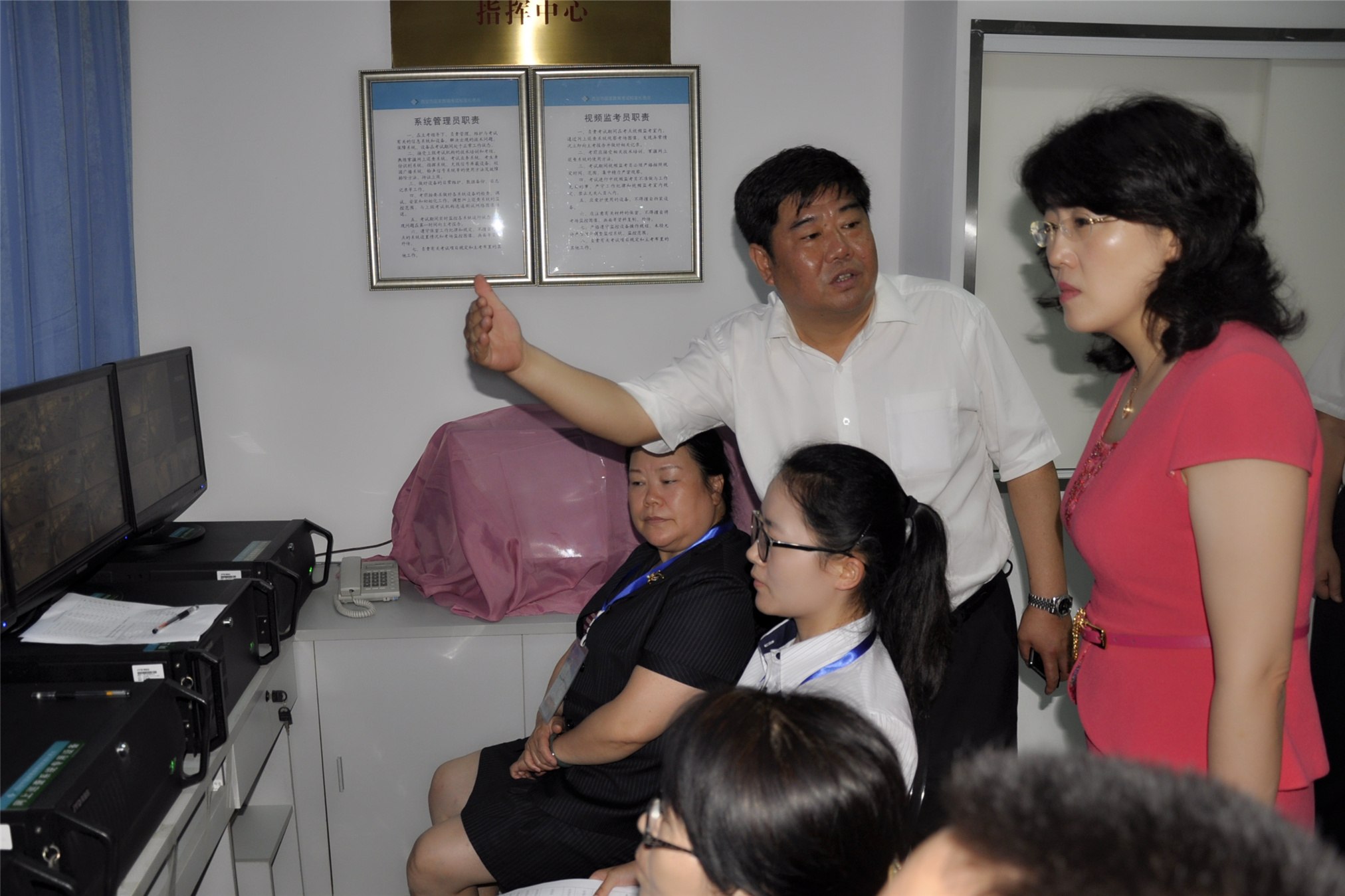 李婧副市长一行在张克强校长等学校领导的带领下,先后查看了我校考点的视频监控室、广播信号室、试题保密室和考务办等相关准备情况。