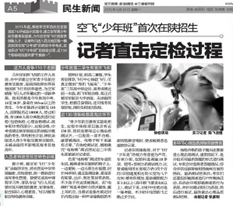3月29日,是我校空军青少年航空学校对第一批517名学生进行定检的第1天,吸引了我省各大媒体关注。当天中午,陕西都市青春频道播出相关新闻,当天晚上,陕西电视台《第一新闻晚间播报》进行专题报道,并对我校张克强校长进行了现场采访。3月30日,各大媒体都进行了详细全面的报道。华商报封面以大幅照片和主标题《想当飞行员,初中就可以报名》为导读,第六版重要新闻进行了半版的专题报道;西安晚报在封面醒目位置图片加标题《空军少年班“选苗”,体检要过128关》,三秦都市报在民生新闻版以《空飞“少年班”首次在陕招生 记者直击定检过程》为醒目标题进行报道。随后,新浪网、搜狐网、中国新闻网等各网络媒体进行了转载报道,香港文汇报于3月31日以《空军“少年班”招生 体检须过百余关》为题进行报道。
