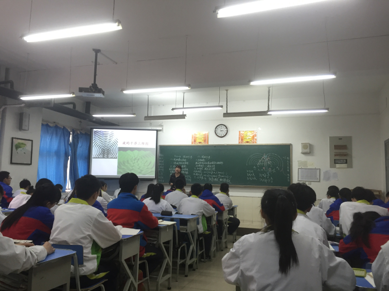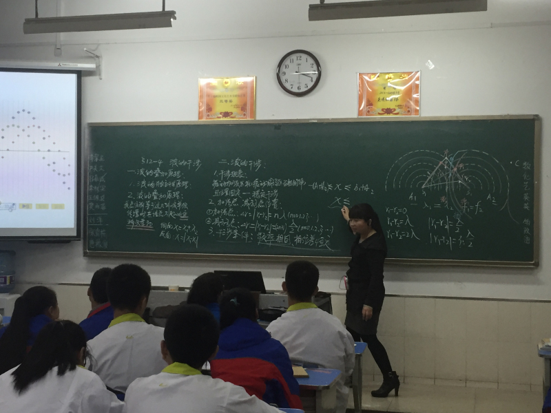 2016年3月16日下午第一节课,我校物理教研组全体教师于高2017届21班教室听取了张莉老师老师选修3-4《波的干涉》的示范课,并于课后在高一集体备课室对本节课进行了分析讨论、研究讲评。总体看来,张莉老师的这节课设计精彩,讲解到位,多媒体应用恰到好处,并且能够将多种多媒体和传统板书恰到好处的结合应用,上课投入且有感染力。给全组老师在多媒体应用以及本节课的设计上提供很多启发和帮助。