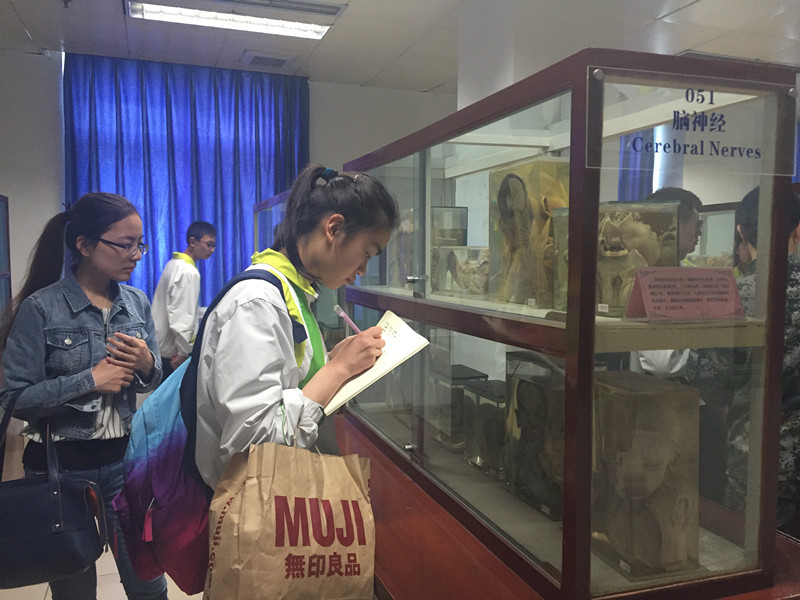 标本馆分为生物馆、人体馆、病例馆、寄生虫馆四个部分,共计6000余件标本,种类多样、保存完整,极具参观价值。第四军医大学的三位教授带领学生依次参观,并进行详尽的讲解,学生们拿着笔记本,边听边记,并不时发问,表现出强烈的求知欲。特别是参观人体馆时,刚开始几位比较胆小的学生还不怎么敢看,随着教授细致的讲解和耐心的引导,也开始发问并表示受益匪浅。