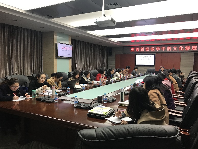 微报告后,老师们就文化视角下的英语阅读教学进行了热烈的讨论,涉及教学与测试的方方面面。阳静主任特别指出英语阅读教学中渗透文化的实现需要教师关注自身的成长与发展。只有不断的学习才能使每个人,无论作为社会层面的人还是教师,接纳并适应不断变化的社会、理解并融通多元文化的世界。