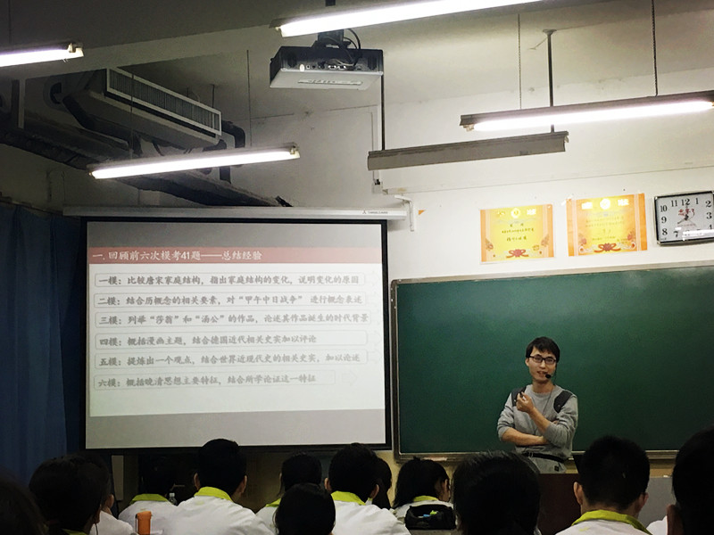 目前距2017年高考只剩一月,因此历史复习的重点在于如何发挥学生的主动性,让学生把知识灵活运用。因此李静老师结合前几次模考中学生所犯的错误,以旧题新思的的形式对相关内容进行具体讲解。李静老师保持以往的教学热情,将一节习题课上的绘声绘色,学生参与度很高,能够在课堂上尽情展示自己的观点,一改习题课的沉闷与单调。他首先将前七次模考当中学生出现的问题进行总结,先与同学一起研究答题方法,进而让学生能够运用正确的答题方法进行有效探索,让学生对于41题更加得心应手,能够在最后的时间养成规范的答题习惯。