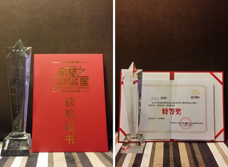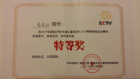 经过初赛(海选),复赛,市赛层层选拔之后,2017年度中央电视台“希望之星”英语风采大赛陕西省总决赛于6月10日至11日在西安市汤峪镇御宾苑酒店举行,来自全省各地市的33名优秀选手战胜了各自的对手之后,来到这里进行最后的省级决赛,争取进入全国比赛的名额。我校高2018届文科二班学生高泽钰沉着应战,经过两天的层层苦战,击败各路选手,最终荣获陕西赛区(高中组)特等奖暨全国赛的