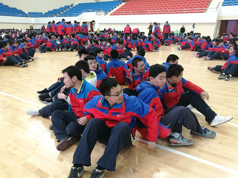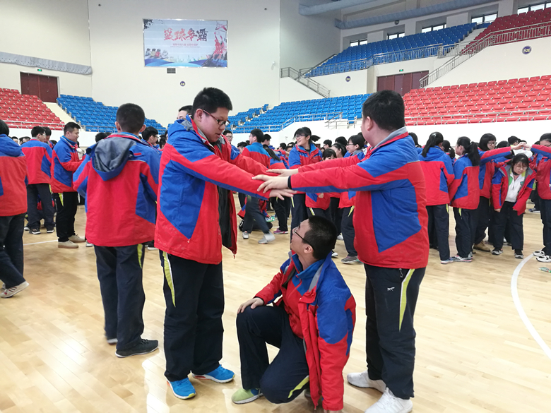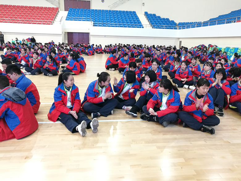 活动以“雨点协奏曲”作为热身游戏,同学们用身体作为乐器奏响了“协奏曲”,既放松了身体,又活跃了气氛;在“松鼠与大树”游戏中,大家三人一组,分别扮成“大树”和“小松鼠”,通过不断地组合与分离,快速打开人际间的壁垒,并体验到由归属感带来的积极情绪;随后,同学们10人一组,进行了“心有千千结”、“坐地与起身”和“快乐大转盘”三个游戏,体验由团结协作带来的巨大力量,体会到自己对学习生活的掌控力。小组同学众志成城、群策群力,现场呐喊声、欢笑声此起彼伏。“旧的不去新的不来”游戏让大家跳出固有的思维模式,重新审视自己的思考方式,学会从新的角度解决问题。在“掌声响起来”活动中,通过对一分钟鼓掌次数的预测数量和实际数量对比,鼓励学生要对自己充满自信心,发掘自身潜力,有效避免预见偏差,刷新假设,以饱满的激情迎战高考!