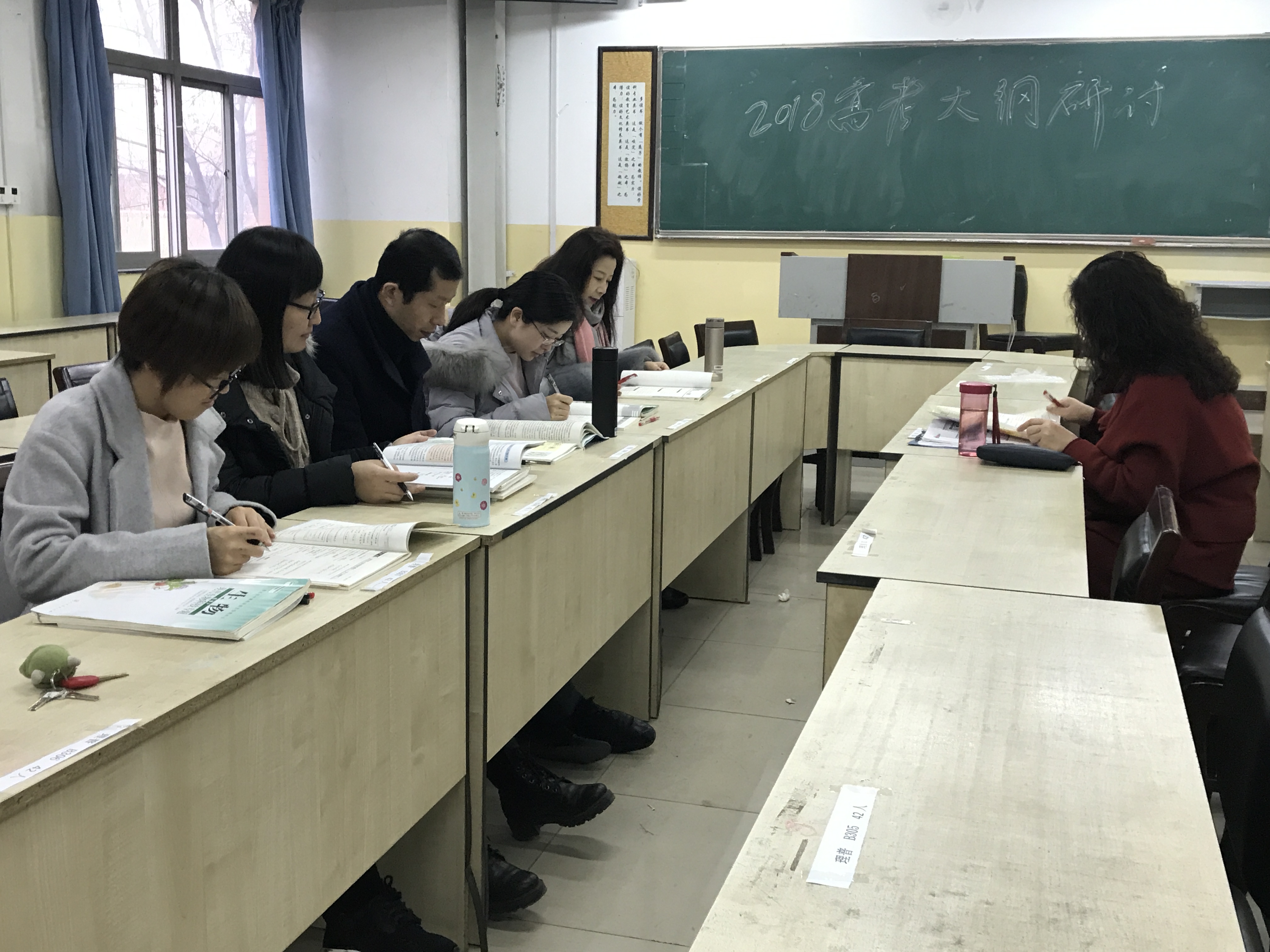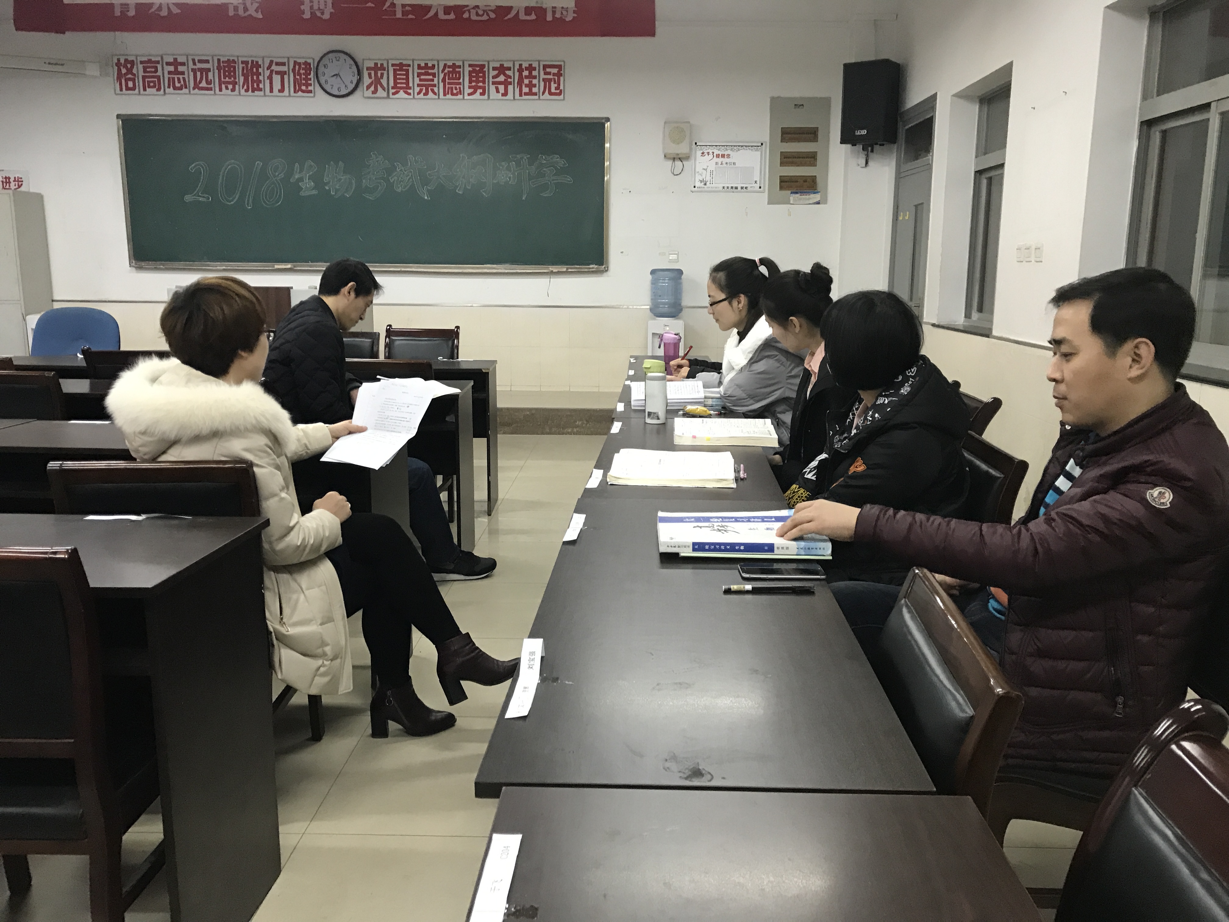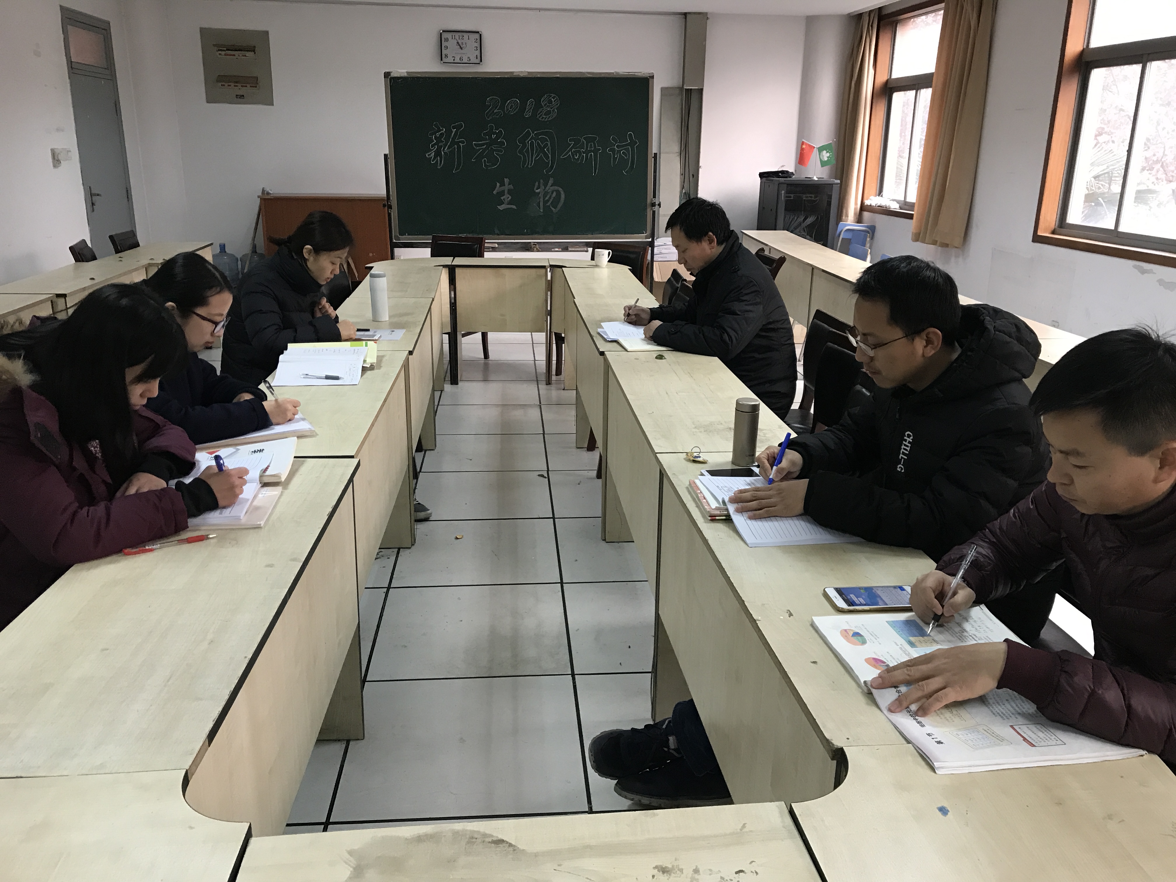 为了更好的把握高考方向,提高生物学科教学的有效性和针对性,2017年12月28日,生物教研组利用集体备课时间,以各年级备课组为单位,研讨新颁布的《2018年普通高等学校招生全国统一考试大纲》(以下简称考试大纲)。考试大纲的相关资料于前一周发给各位老师进行学习、研究。在本次研讨过程中,各备课组根据新颁布的考试大纲内容,对比之前内容研究其变化趋势,展望未来的高考发展趋势。更重要的是,各备课组结合本年级的教学实际,研讨考试大纲对目前本年级现阶段和未来一年或者两年生物教学的指导性,思考现阶段的教学如何为将来的高考打好基础。
