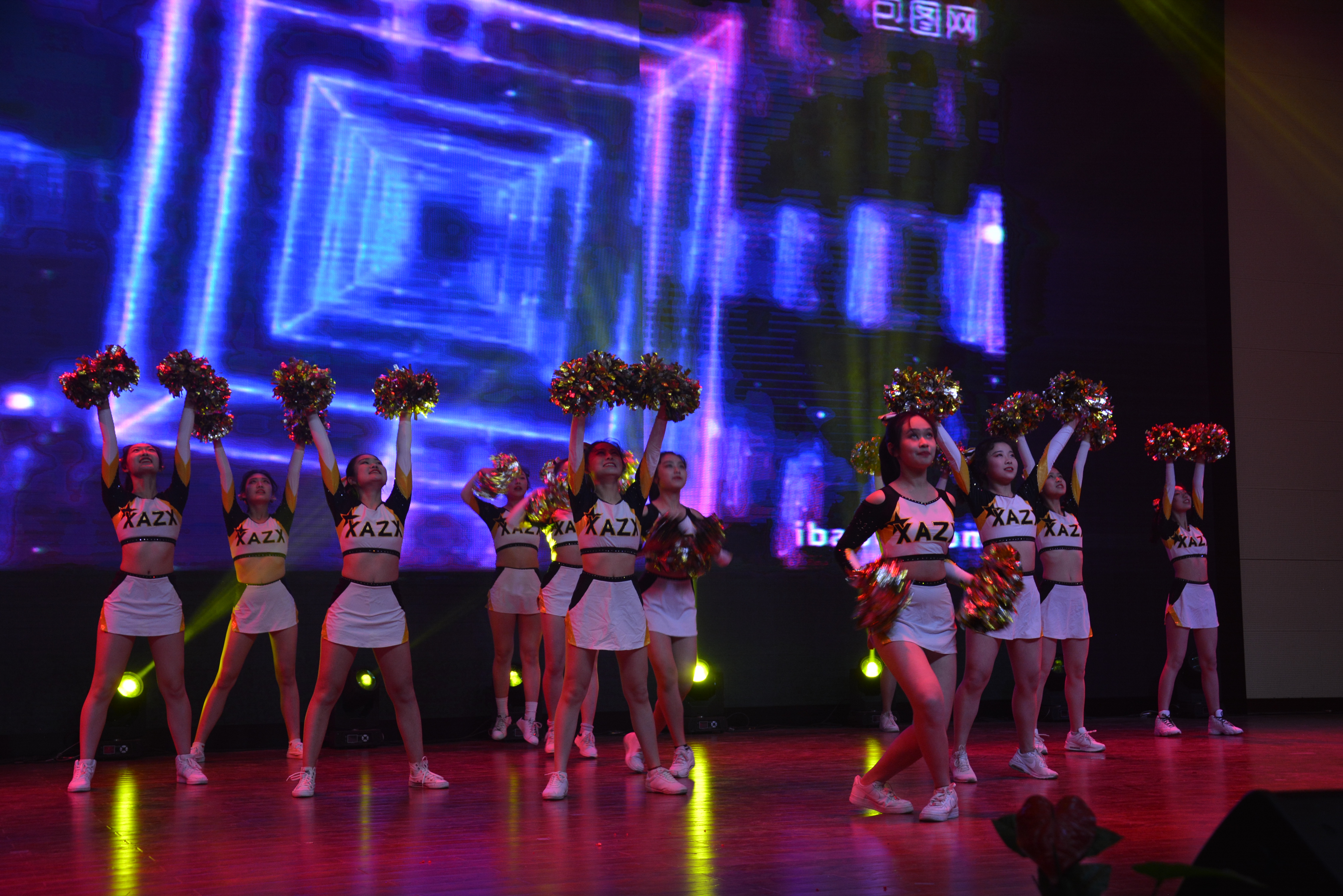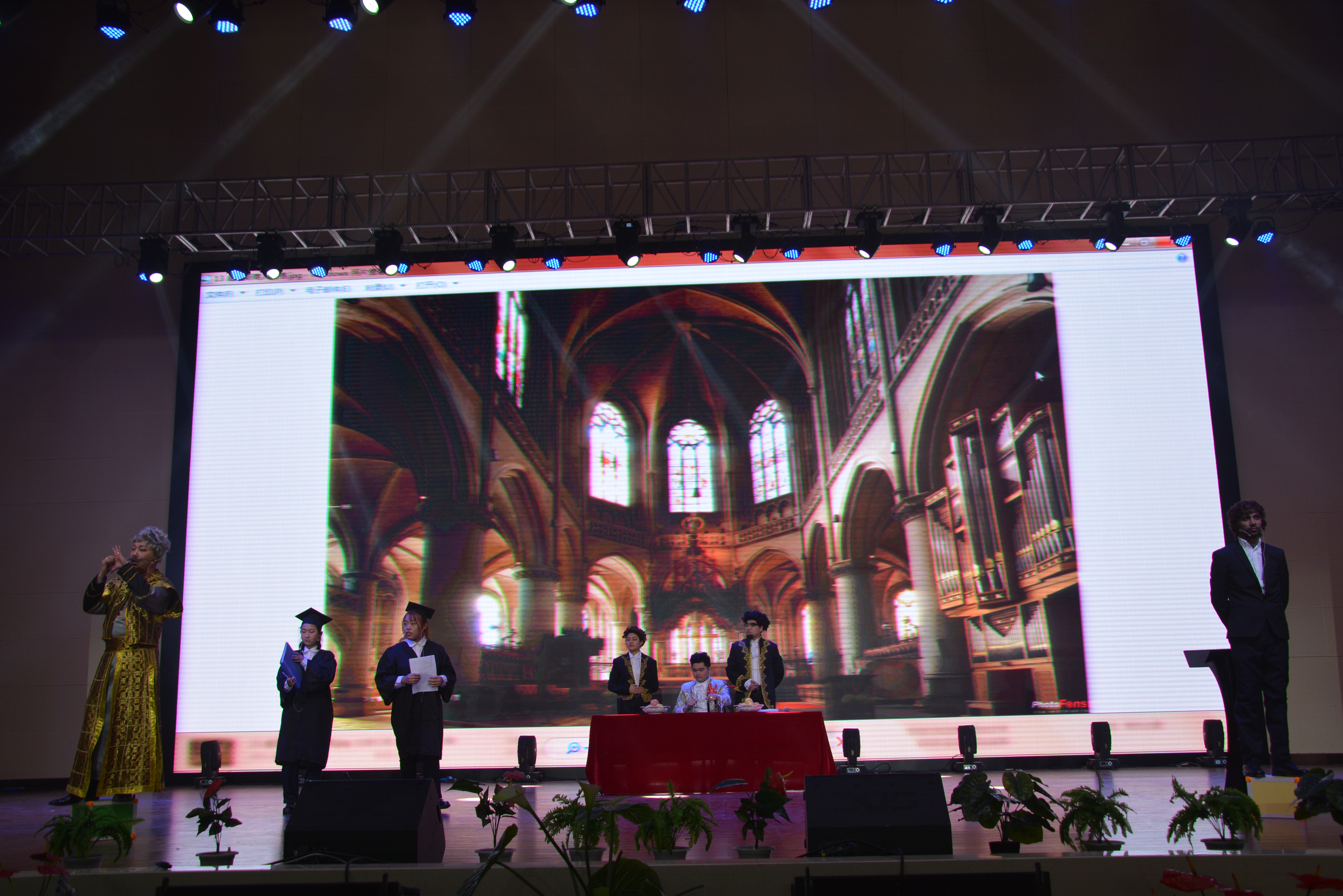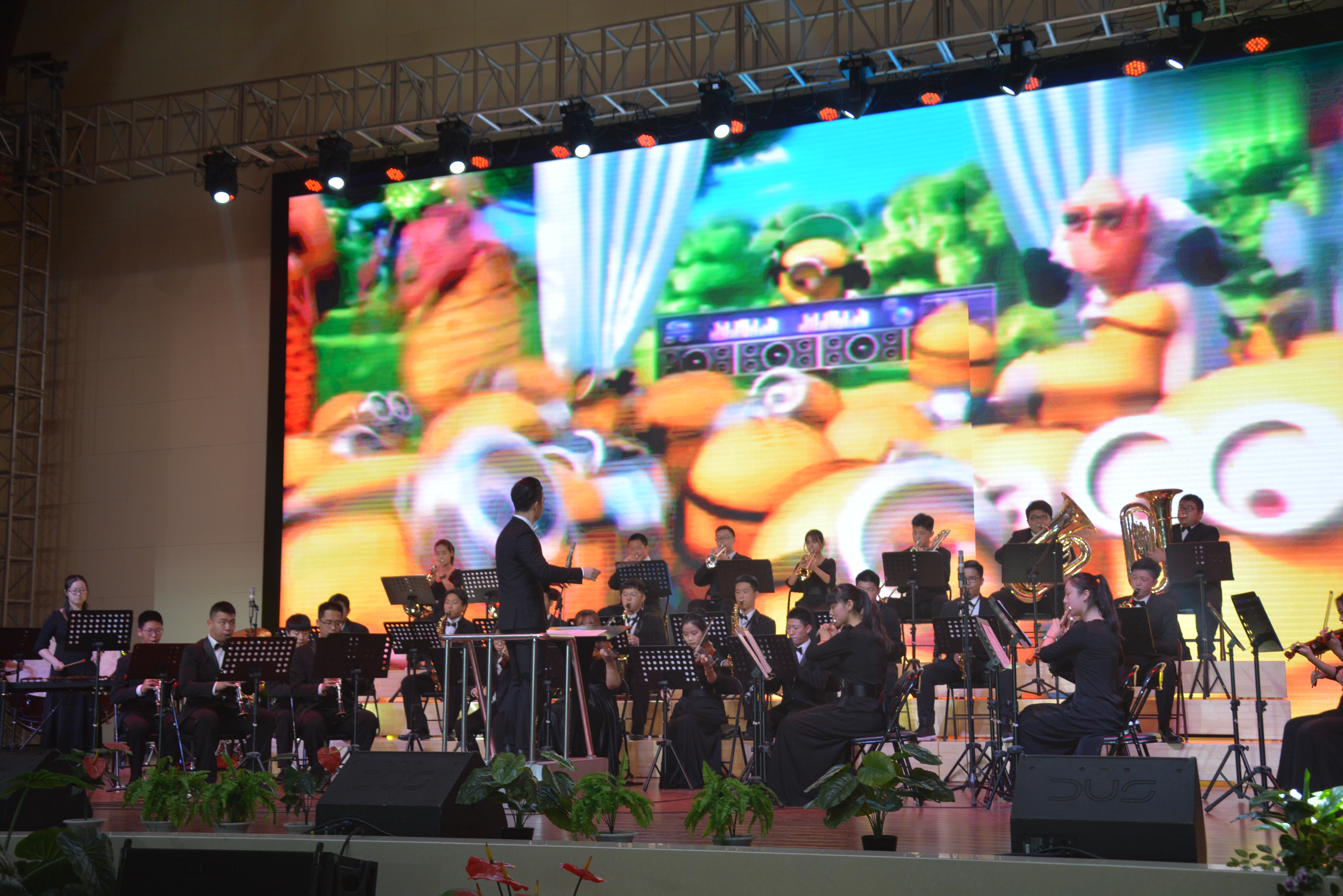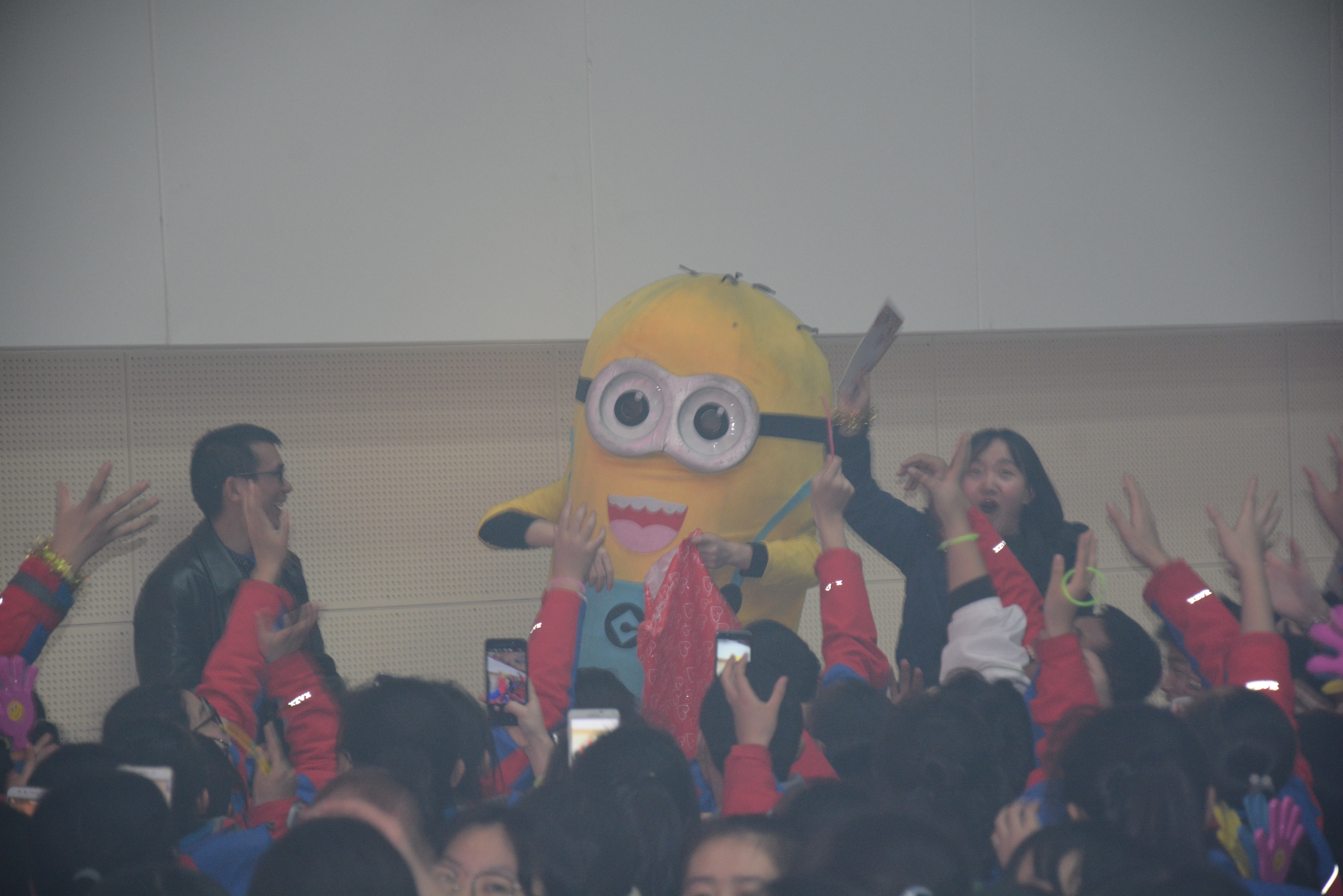 演出开始之前,校电视台播放了精心制作的贺岁片,预热了整个会场。同学们看到自己熟悉和喜爱的老师,掌声与呐喊声响彻体育馆上空。随着“5、4、3、2、1”倒数,大幕徐徐拉开,西中管弦乐队激情演奏《勇往直前进行曲》把观众吸引到舞台来,《动漫神偷奶爸(2)主题曲——happy》配着学生最喜爱的画面做背景,还有台下出现在观众席中的小黄人,全场顿时嗨起来!