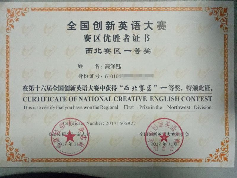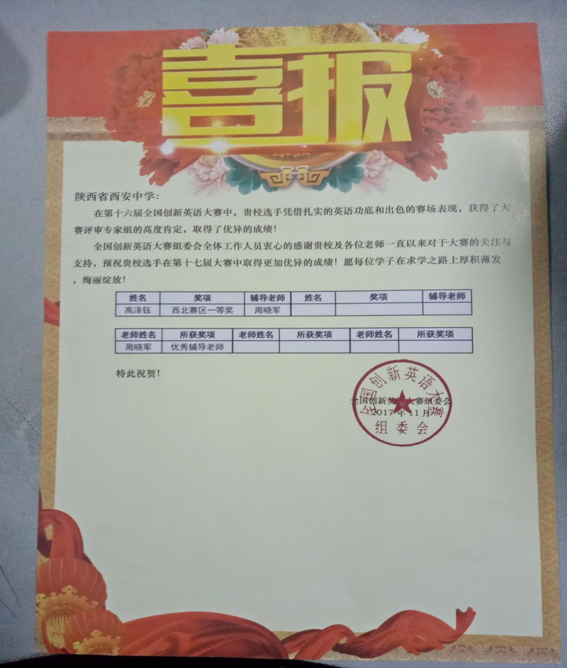 在第十六届全国创新英语大赛中,我校高2018届文科2班学生高泽钰凭借扎实的英语功底和出色的赛场表现,取得了优异的成绩并荣获西北赛区一等奖,特向大家报喜!