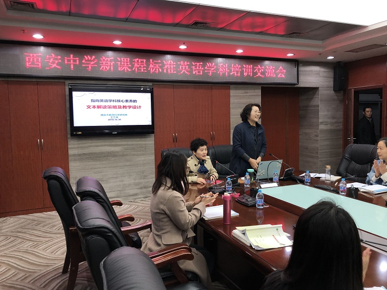 2018年10月30日星期二,我校英语教研组有幸邀请到了西安市教育学科研究所中学英语教研员、省学科带头人、中学英语高级教师王兰英老师,为英语教研组进行了新课程标准英语学科培训,培训的主题是文本解读策略及教学设计,英语组全体老师在组长代庆云老师的组织下参加了本次培训活动。