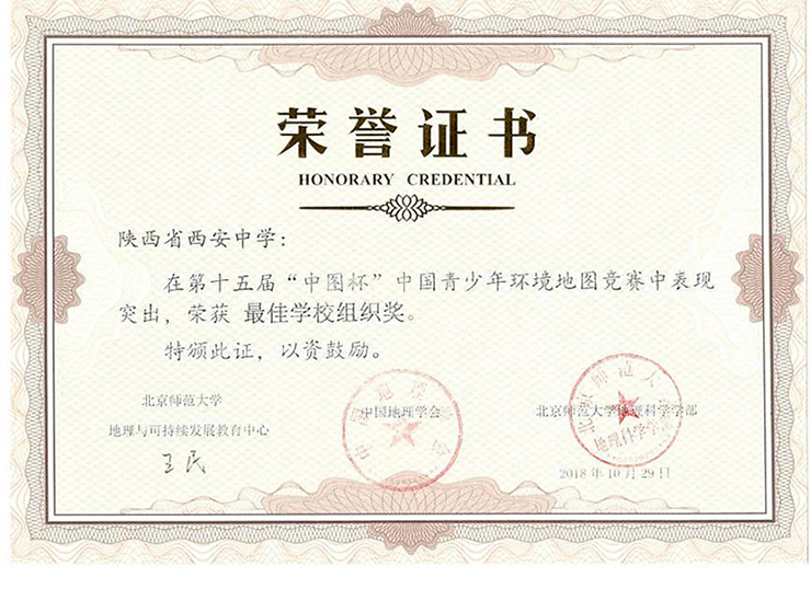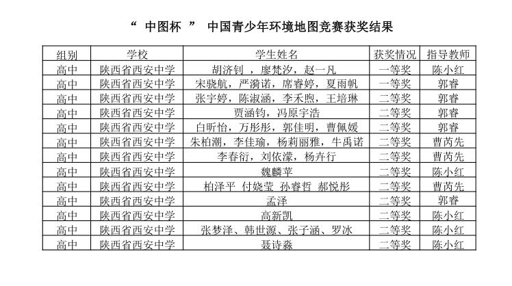 第十五届“中图杯”中国青少年环境地图竞赛比赛结果近日在北京揭晓。西中共36名学生的13幅作品荣获全国一、二等奖。我校荣获“最佳学校组织奖”,地理组郭睿、陈小红老师也荣获优秀指导教师奖。本次成绩的取得离不开学校和高2019届年级部的大力支持,也是高三地理备课组老师的认真指导的结果。