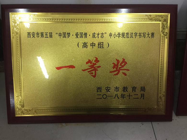 汉字是上古时期文字体系中唯一传承至今的表意文字,包含着汉民族祖先智慧的结晶,是中华文明最灿烂的瑰宝之一。汉字又是世界上最难书写的文字。独特的方块字形需要不断记忆,反复练习才能形成书写能力。为贯彻落实《国家通用语言文字法》以及《国家语言文字事业“十三五”发展规划》,进一步规范我市中小学学生汉字书写,2018年12月4日,西安市教育局组织全市优秀高中组代表队在西安市第89中学举办了2018年西安市“中国梦·爱国情·成才志”中小学规范汉字书写大赛的高中组比赛。共有来自全市各区县的24支优秀的代表队参赛,其中不乏铁一中、交大附中这样的强队。我校高2020届的高远、张钊汇、杨义晨、贺嘉铭四名选手在指导老师王晓开老师的带领下,在比赛中突出重围,荣获高中组第一名。