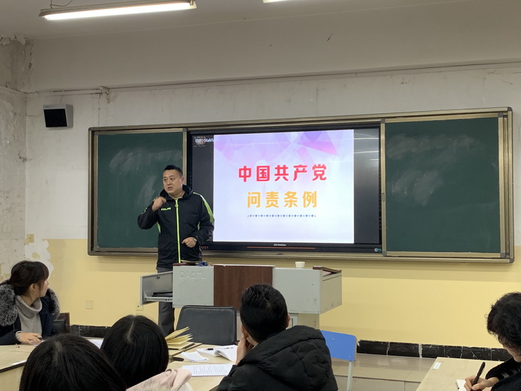 会议第一项是“支部书记讲党课”活动。徐仕岿书记对《中国共产党问责条例》相关内容进行介绍与讲解。《条例》是党的十八大以来管党治党理论和实践创新成果,是全面从严治党重要的制度遵循,对于统筹推进“五位一体”总体布局和协调推进“四个全面”战略布局,实现党的历史使命,具有十分重要的意义。支部通过学习《条例》,以“问责”促“担责”,激发党员的担当意识和担当精神,推动教育教学工作取得更大进展。