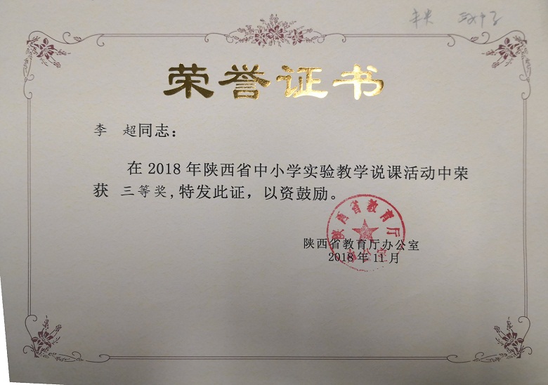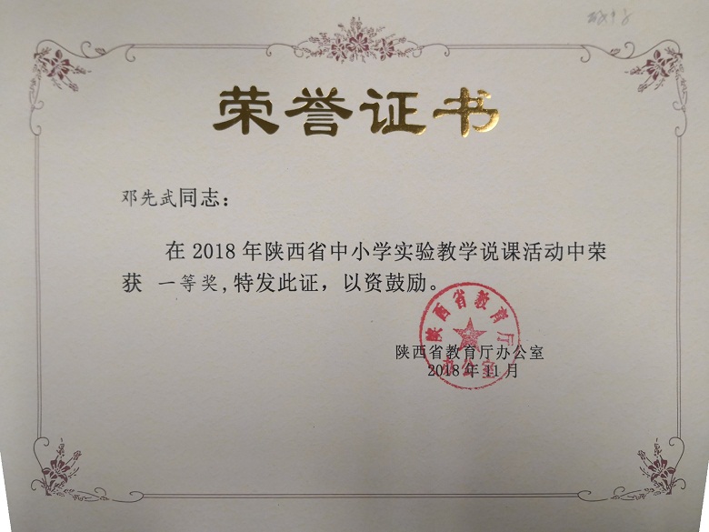 陕西省2018年中小学实验教学说课活动获奖情况日前揭晓,我校教师邓先武荣获陕西省中小学实验说课大赛一等奖,李超荣获三等奖。