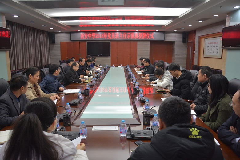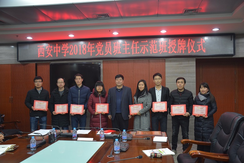 我校党委委员李文耀同志代表党委宣读了《中共陕西省西安中学委员会关于对2018年党员班主任示范班授牌的决定》,党委书记张克强依次为九位获得荣誉的班主任老师颁发奖牌、证书,并合影留念。