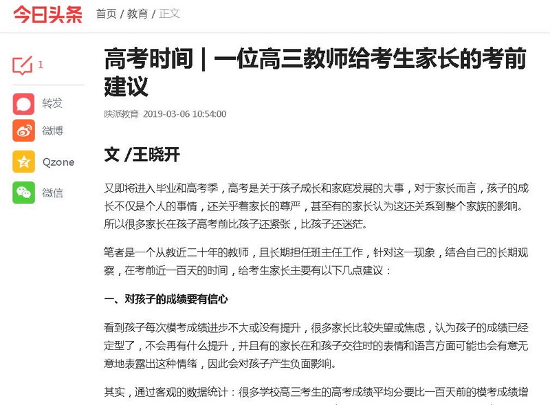昨天《陕西教育》头条刊登了我校王晓开老师的文章——《给考生家长的考前建议》,这是王晓开老师对高三家长会的发言进行了整理和总结形成的文章,希望对大家有所帮助。
