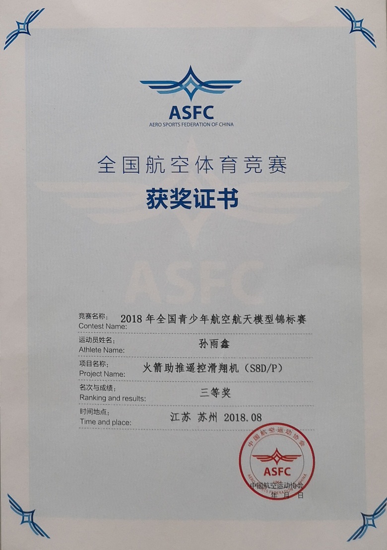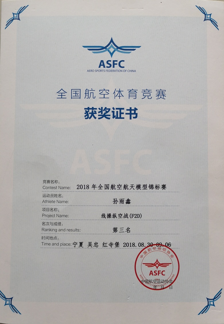 2018年对于我校高2019届19班孙雨鑫同学,既是努力的一年,又是收获的一年。在2018年全国航空航天模型竞标赛中,孙雨鑫同学取得“线操纵空战(F2D)”项目第三名及“二级遥控室内特技(P3P)”项目第五名;在2018年全国青少年航空航天模型竞标赛中,取得“火箭助推遥控滑翔机(S8D/P)”项目第三名;在”陕西省航空体育大会暨2018年陕西省青少年航空航天模型比赛中,取得“遥控火箭助推滑翔机(S8C)”项目第一名的好成绩。