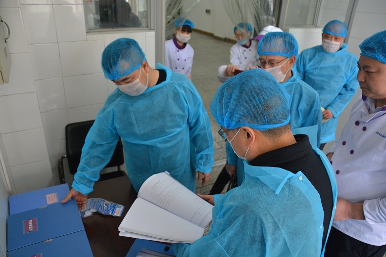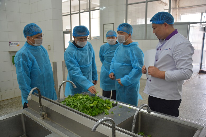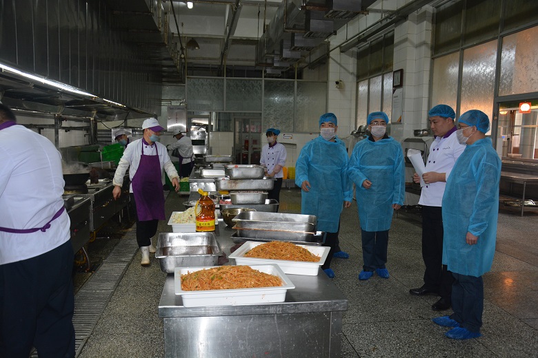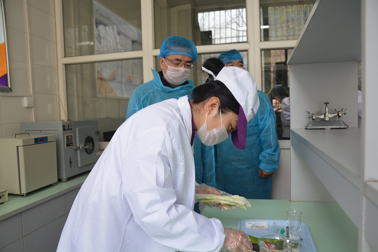 检查组一行现场查看了员工健康证,食品经营许可证等有效证件,对员工的仪容仪表,个人卫生进行检查。检查组进入食堂后厨根据食品加工生进熟出的原则进行现场查验。首先检查组就原材料的进货渠道,抽检工作、台账、索证索票、留样箱进行现场检查询问并现场查看我校独有食品检测室,对农残,吊白块、苏丹红及餐具大肠杆菌的抽检情况进行现场查验,对毛菜、主食储存、毛菜摘洗、净菜切配、加工制作、现场保温及留样环节进行检查。检查组一行详细的对加工制作人员进行了现场询问,了解加工制作规范。最后,检查组一行走进洗消间,对餐具的洗消过程及洗消过的餐具保洁情况进行了现场检查,对食品添加剂的规范使用进行现场督导。
