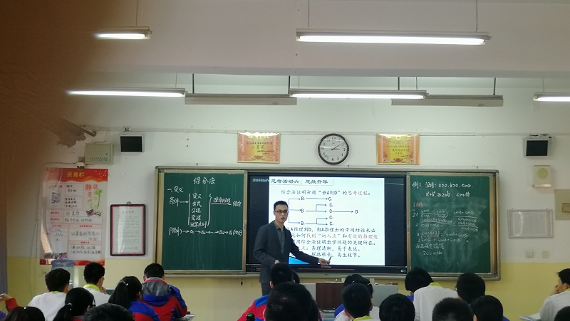 龚老师的示范课上,从两道练习题出发,复习了上节课所学的知识,并引出了本节课所学知识——综合法。通过两道典型例题的讲解,学生自主的总结出综合法的一般思路流程,并且通过两道练习题加以巩固。整堂课设计合理、逻辑清晰,节奏张弛有度。学生课堂气氛活跃,收获满满,并结合例题进行强化练习。学生参与度高,讲练结合,很好的完成了教学任务。