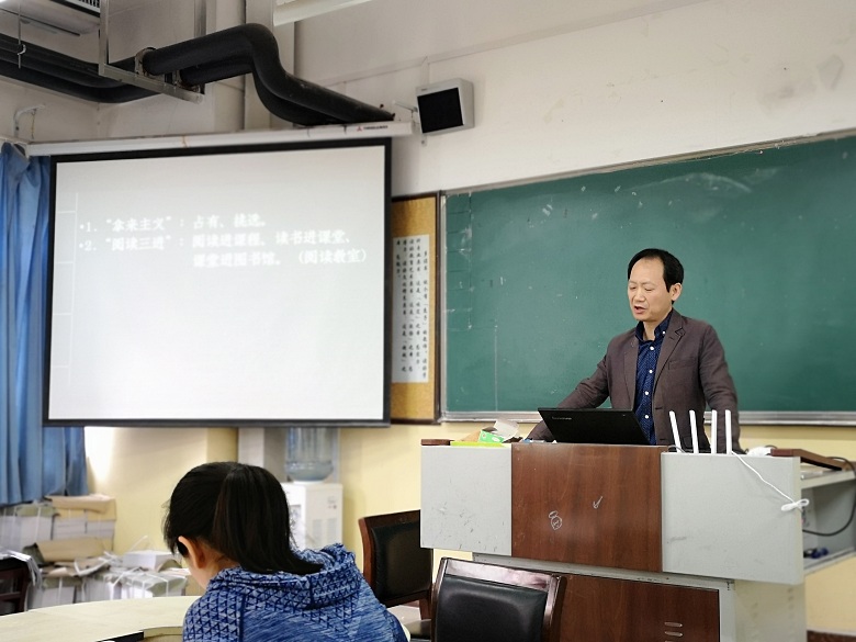 许冬老师重点从两个方面谈论自己对《四库全书》与中学语文的思考,一是内容与中学语文、二是藏书与中学语文。许老师严肃而风趣地说到“一个语文老师,无论这一生怎样蹦跶,也跳不出《四库全书》的如来掌心”,他从“拿来主义”“三进阅读”等五个方面阐述自己的教学设想,启发了大家对如何利用好我校馆藏《四库全书》资源的思考。