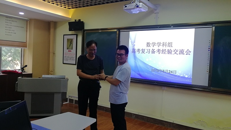 朱英会老师代表2019届高三数学组将复习备考资源以优盘的形式交给2020届新高三数学备课组组长吴贺笃老师。对后续的复习备考也提出很宝贵的意见。