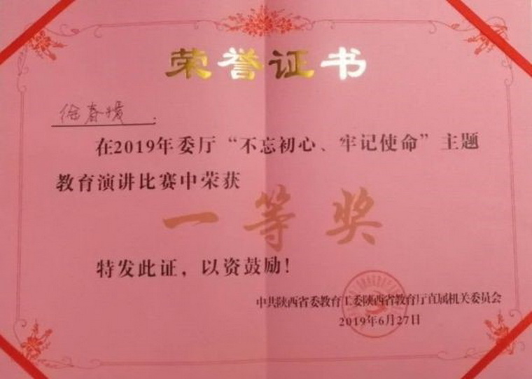 2019年6月27日下午,由省委教育工委省教育厅主办的“不忘初心,牢记使命”主题教育演讲比赛总决赛在机关会议室第一会议室举行,来自委厅机关、直属单位和中职学校的20名选手参加决赛,经过激烈角逐,我校青年教师徐春媛老师在比赛中获得最高分,获得演讲比赛一等奖。