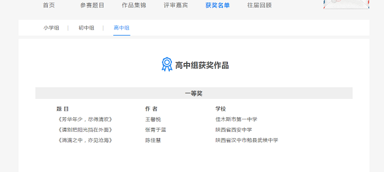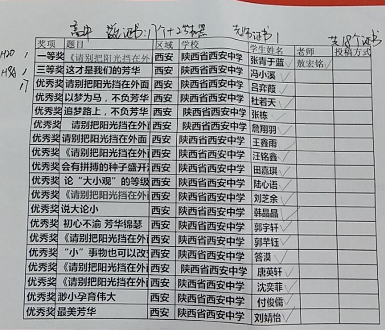 第十一届全国步步高作文大赛,陕西赛区成绩优异,高中组全国一等奖两名,我校原高一、1班张青于蓝喜获一等奖。高中组全国三等奖七名,我校原高一、4班冯小溪喜获三等奖。优秀奖若干,我校17名同学获得优胜奖。