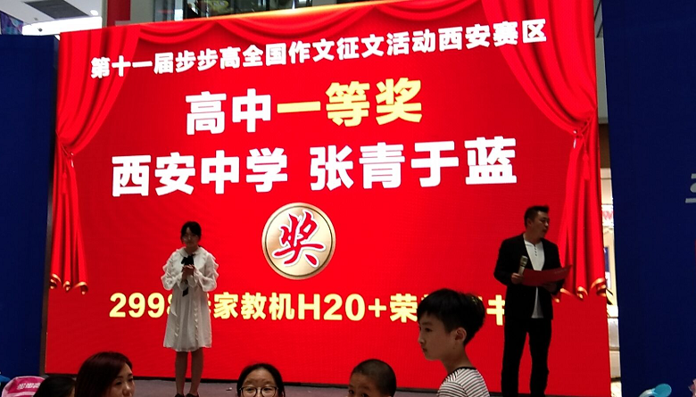 8月31日及9月1日,步步高西安公司在华夏幸福里举办全国作文大赛西安赛区颁奖仪式,我校部分获奖学生参加了颁奖仪式。一等奖奖品为步步高家教机H20+荣誉证书,三等奖奖品为步步高家教机H9A+荣誉证书。