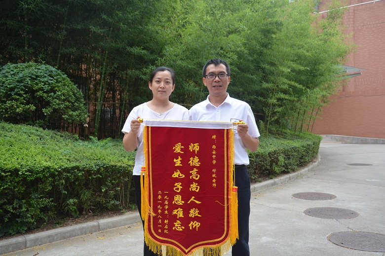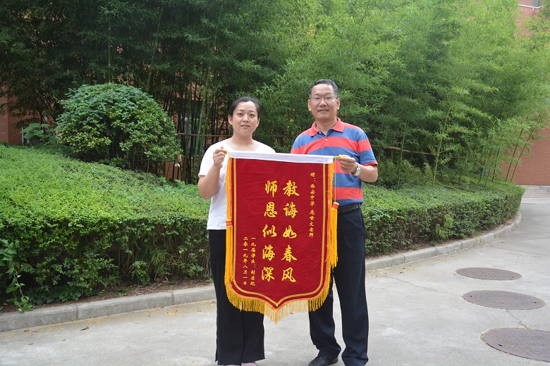 值此教师节来临之际,9月4日下午,高2019届10班学生封启纪的家长,给孩子高中的班主任付斌老师和庞世文老师分别送来了锦旗,既祝愿老师们节日快乐,又表达学生家长对老师们的感谢、感恩之情。