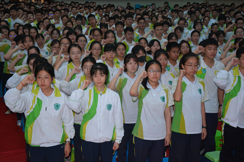 “立品如松经风霜方可柱名堂成大厦,检身若玉磨沙石乃堪琢圭璋宝庙廊”,舞台两侧红底白字的巨幅长联映入每一个学生的眼底。愿他们追求高远,胸怀大志,眼底有光,心中有爱,执著坚定地行进在高考征途中。