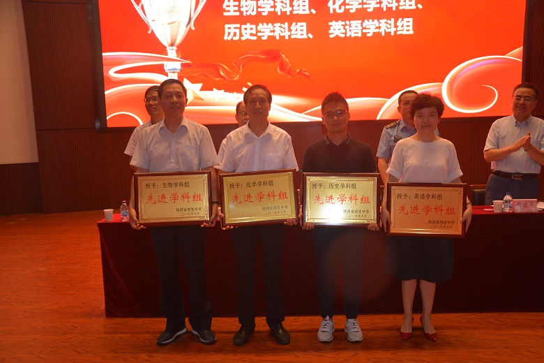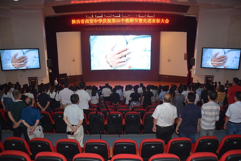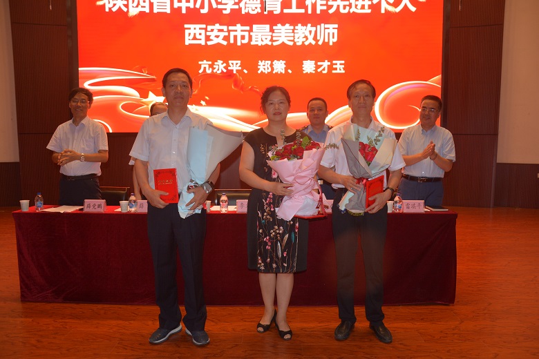 在振奋人心的颁奖进行曲中,获得全国优秀教师、陕西省中小学德育工作先进个人及西安市最美教师的亢永平、郑箫、秦才玉三位老师和年度先进集体、个人的代表和老师们依次上台领奖。